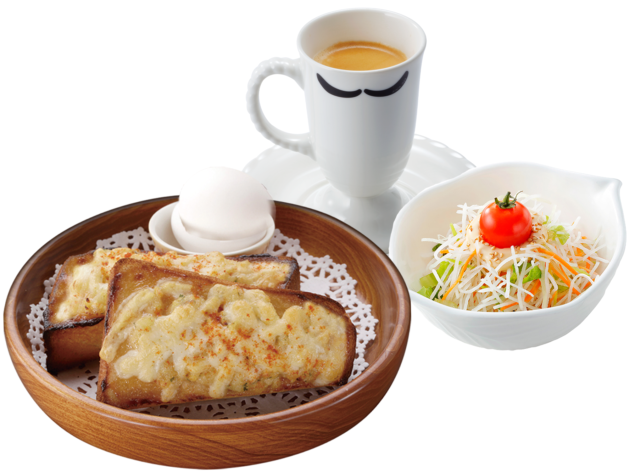 たっぷりととろけたチーズがかかり、食欲をそそる一品。シンプルなトーストでは少し物足りない!という人に人気です。ゆで卵付き。※写真はドリンク・サラダセットです。
