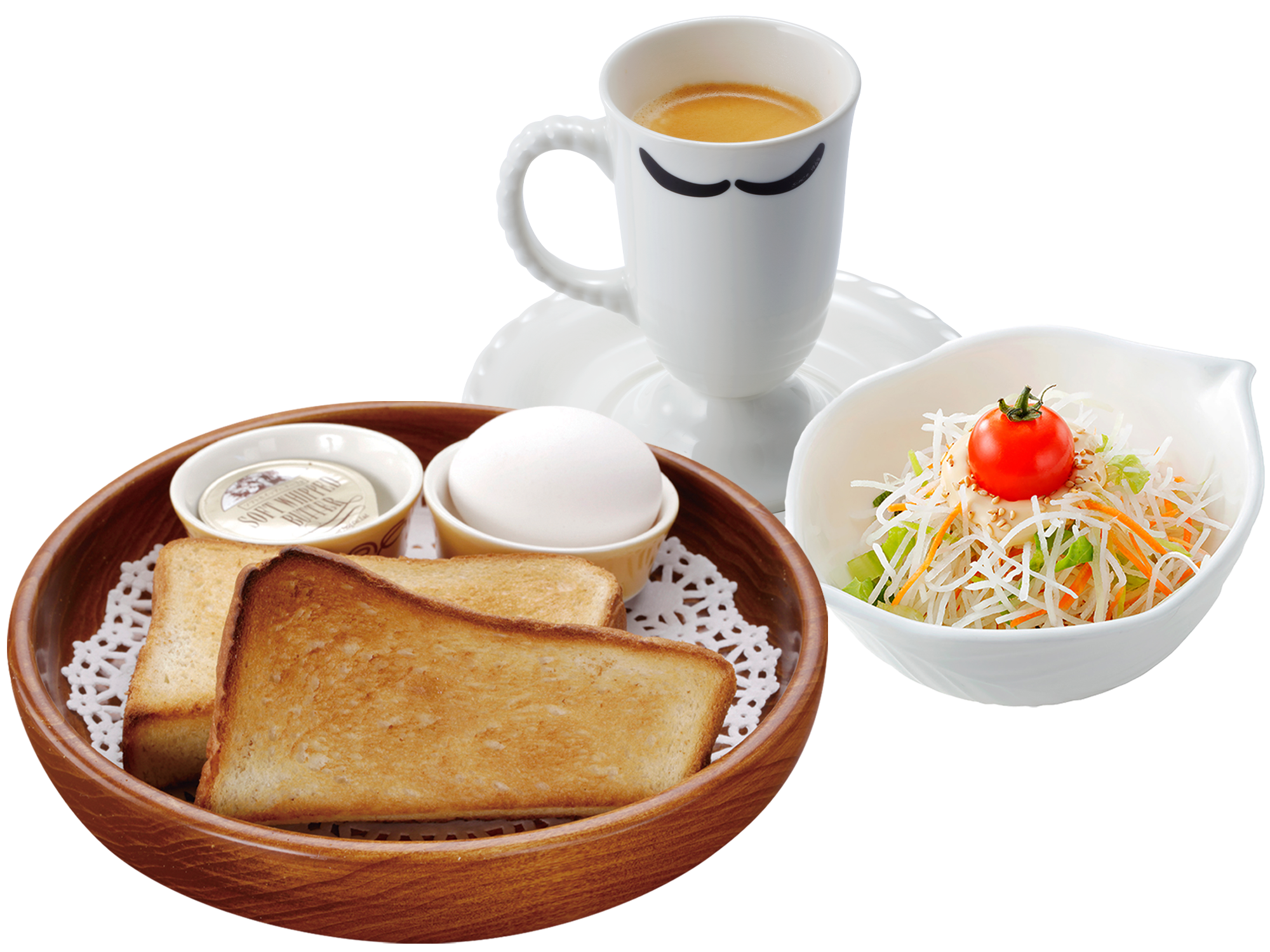 こんがりと絶妙に焼き上げられた香ばしいトーストとゆで卵がセットになった朝食界の王道メニューです。