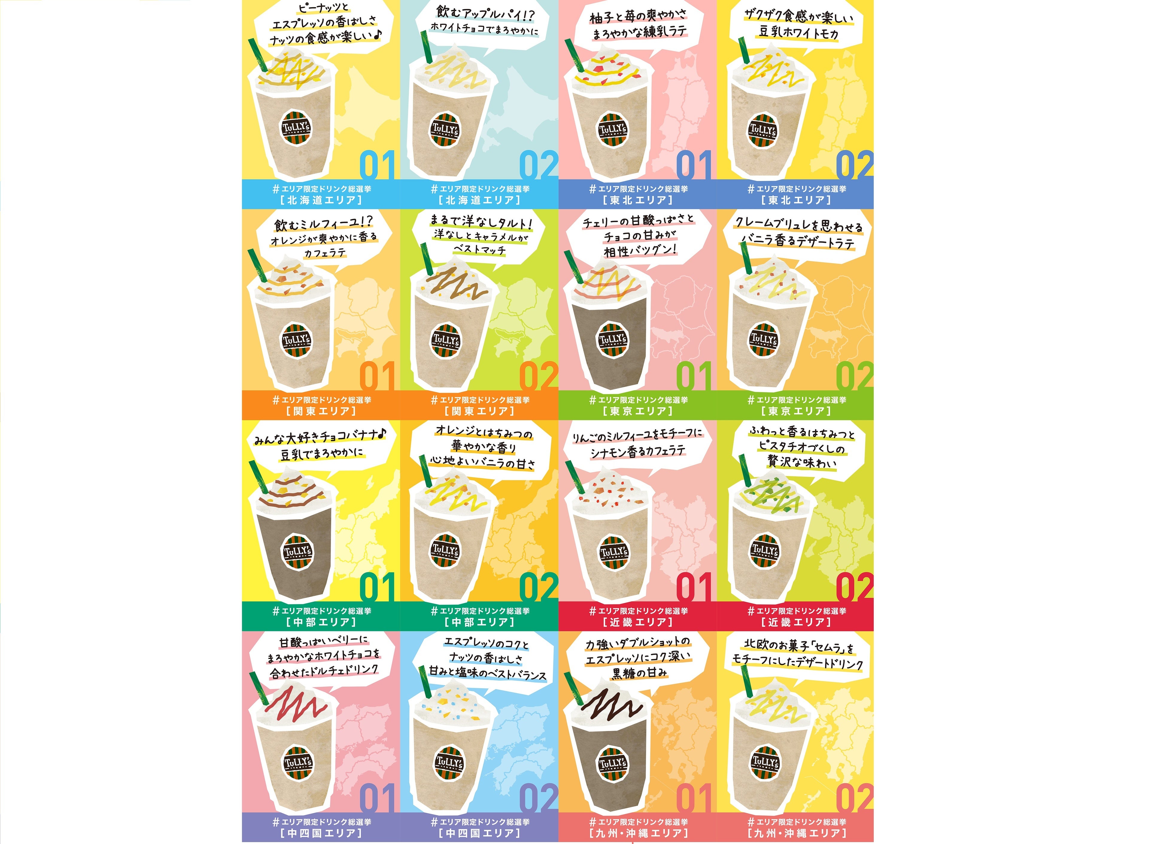 内容:9月30日(金) 全国8エリアでそれぞれ限定発売するドリンクを皆様からの投票により選出、商品化して発売。投票エントリーしているドリンクは各エリア在籍フェローの考案ドリンクです。