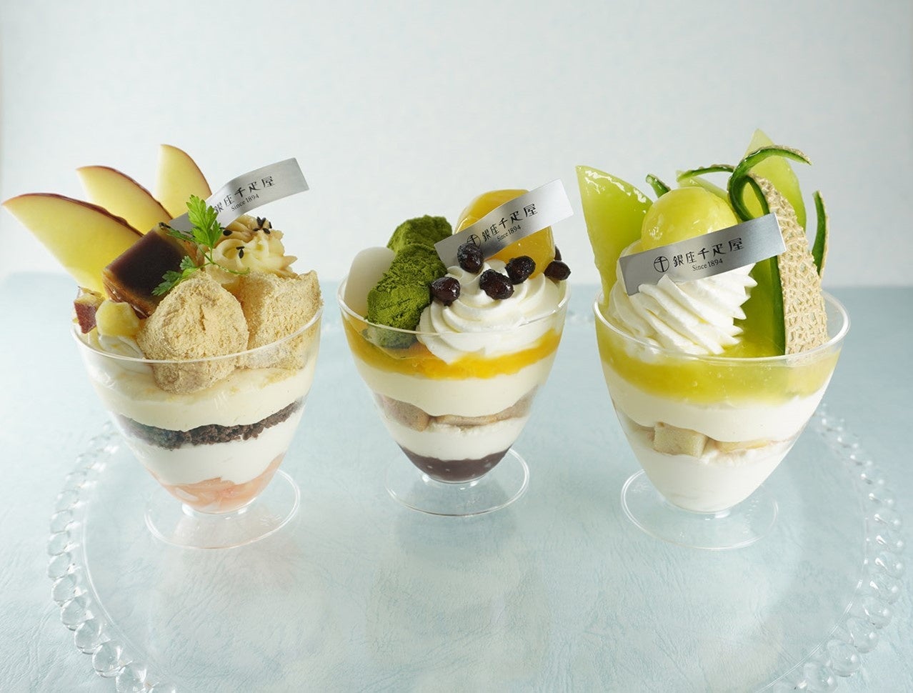 銀座千疋屋を代表するマスクメロンを贅沢に使用した“メロンパフェ”、花園万頭の代表銘菓を甘なつと、スイートポテあん、こしあん等をフルーツとあわせた“和風パフェ”、“りんごとさつまいものパフェ”のラインナップです。