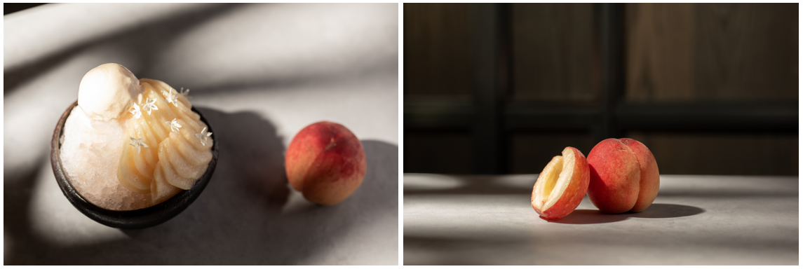 夏の旬を取り入れた、国産桃をまるごと1個使用した「星涼し(ほしすずし)」と静岡県産抹茶とほうじ茶シロップ・生クリームの3種で味変を楽しむ「涼雨(りょうう)」の2種類をラインナップ。