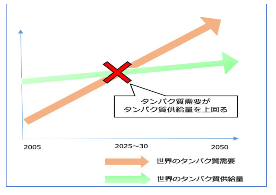 世界人口の増加による動物性たんぱくの供給不足(プロテインクライシス)*図1が予測される中で、たんぱく質が豊富な大豆には、食肉に代わるたんぱく源として関心が高まっています。家畜牛のゲップで排出されるメタンガスは地球温暖化の一因とされており、大豆ミートへのシフトは環境面からも重要です。低カロリー・低脂質で健康志向に沿ううえ、長期保存が利く利点もあります。