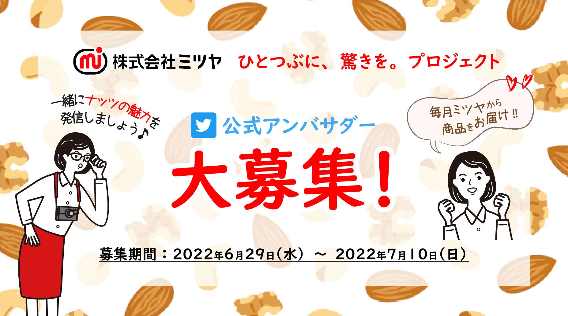 「ひとつぶに、驚きを。」をスローガンに豆・ナッツの製造販売を行う株式会社ミツヤ(本社:福岡県福岡市、代表取締役:原田 耕次、以下ミツヤ)は、ミツヤ初の公式アンバサダーを2022年6月29日(水)~7月10日(日)まで募集します。『ミツヤ ひとつぶに、驚きを。プロジェクト』と題し、第1回目の今回は、10名のアンバサダーを選抜し、7月22日(金)ナッツの日から2022年12月31日(土)までの6か月間『ミツヤナッツアンバサダー』としてTwitterなどのSNSで発信していただきます。