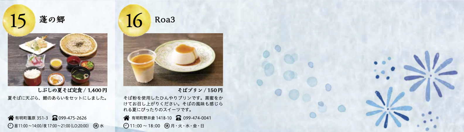 - 【そば茶屋吹上庵 志布志店】 ☎︎099-473-3383 [住所] 鹿児島県志布志市志布志町安楽6110 [営業時間] 10:30~21:00(オーダーストップ20:30) [定休日] なし
