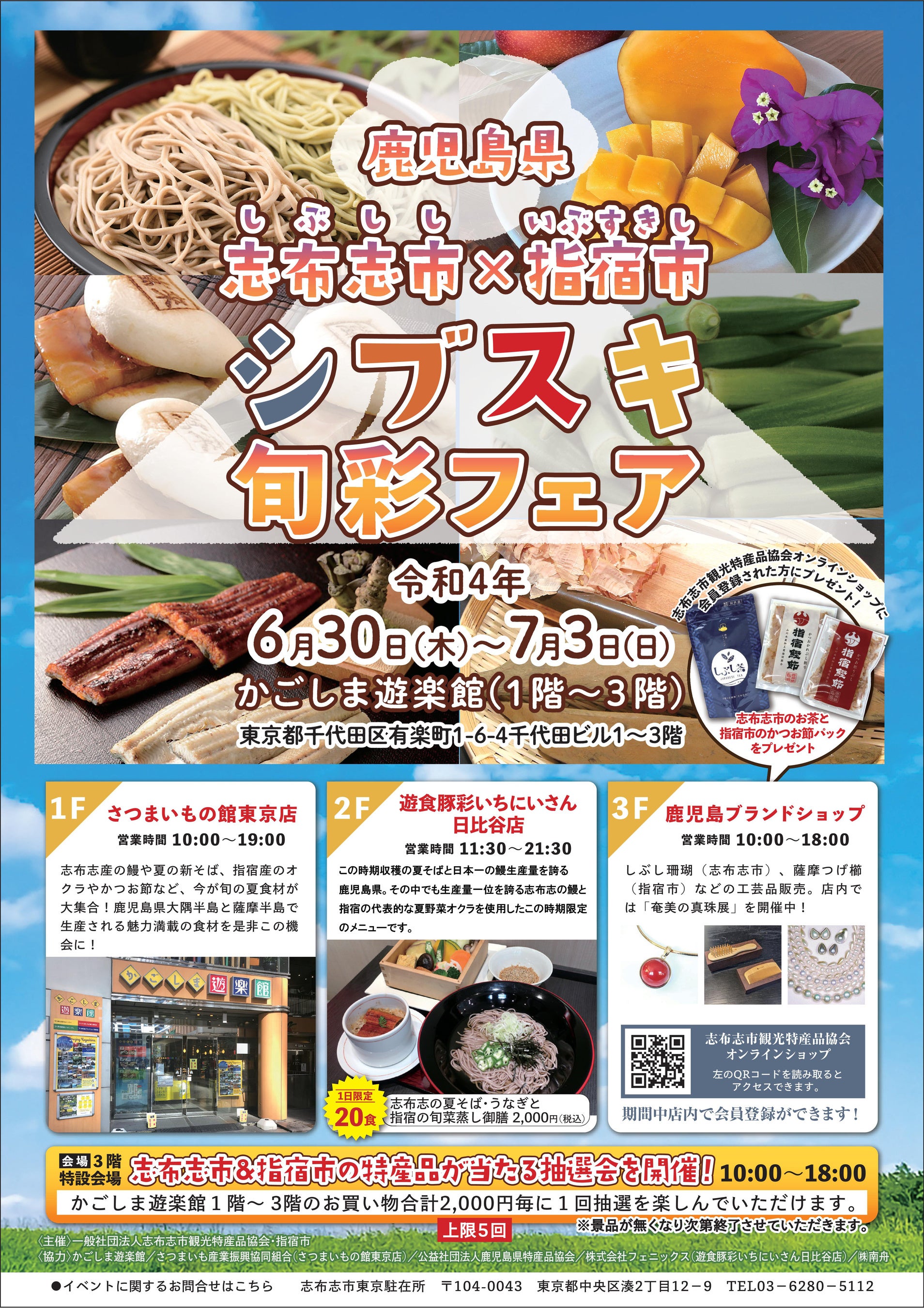 昨年ご好評をいただいた志布志市と指宿市の共同イベント「シブスキ旬彩フェア」の第2弾をかごしま遊楽館(東京都千代田区)で今年も同時開催します。(令和4年6月30日〜7月4日)