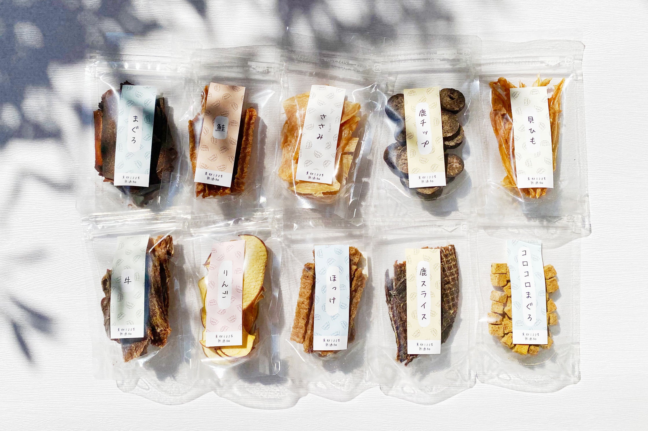 (上から脂質の低い順に)りんご・ささみ・ささみふりかけ・鱈・鱈ふりかけ・鮭・貝ひも・かつお・鹿チップ・コロコロまぐろ・鹿スライス・牛・馬・納豆・豆腐・ほっけ