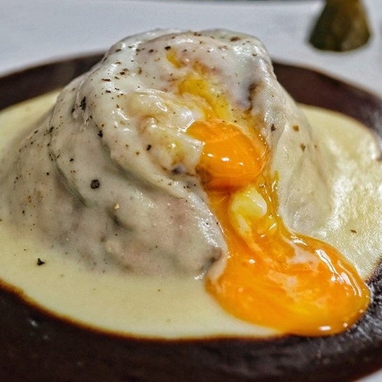 盛り付けにかなり凝っていて、富士山型に盛ったご飯に、自家製のローストビーフを巻き付け、“頂上”に温泉卵を一つ。そこに深みのある自家製の焙煎カレーをたっぷりとかけ、最後に北海道産ジャガイモ2種類をブレンドしたポテトクリームソースで覆えば完成です。