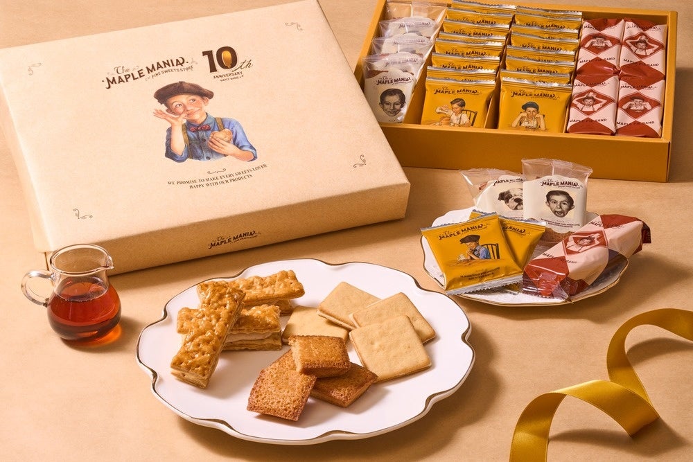 ザ・メープルマニア10周年を記念いたしまして、今までの感謝の気持ちを込め、待望の3種詰合せを発売いたします。人気No.1を誇る「メープルバタークッキー」と「メープルフィナンシェ」、更に「メープルパイサンド」が入った3種詰合せは、大切な方への贈り物やおみやげにもおすすめです。10周年のロゴがきらりと光るパッケージは期間限定となりますので、この機会にぜひご利用ください。