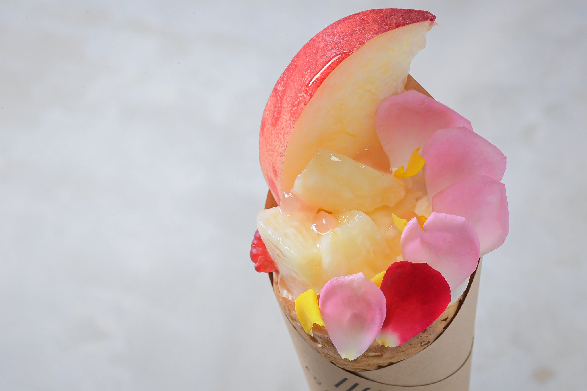 - フレッシュな薔薇とジューシーな白桃をたっぷりとほおばるクレープ
