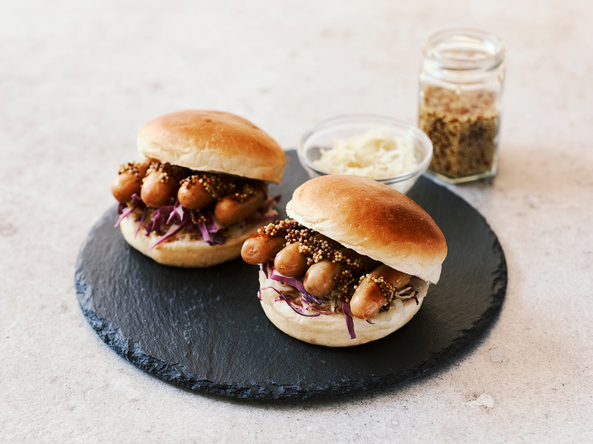 今回は、北海道産小麦を使用したふんわり香ばしいバンズに、「ドイツポークソーセージ」を2本分贅沢にサンドしました。2種のザワークラウトと新潟県南魚沼産の無添加粒マスタードが、ソーセージの旨味をより引き立たせ、病みつきになる味わいに仕上げました。