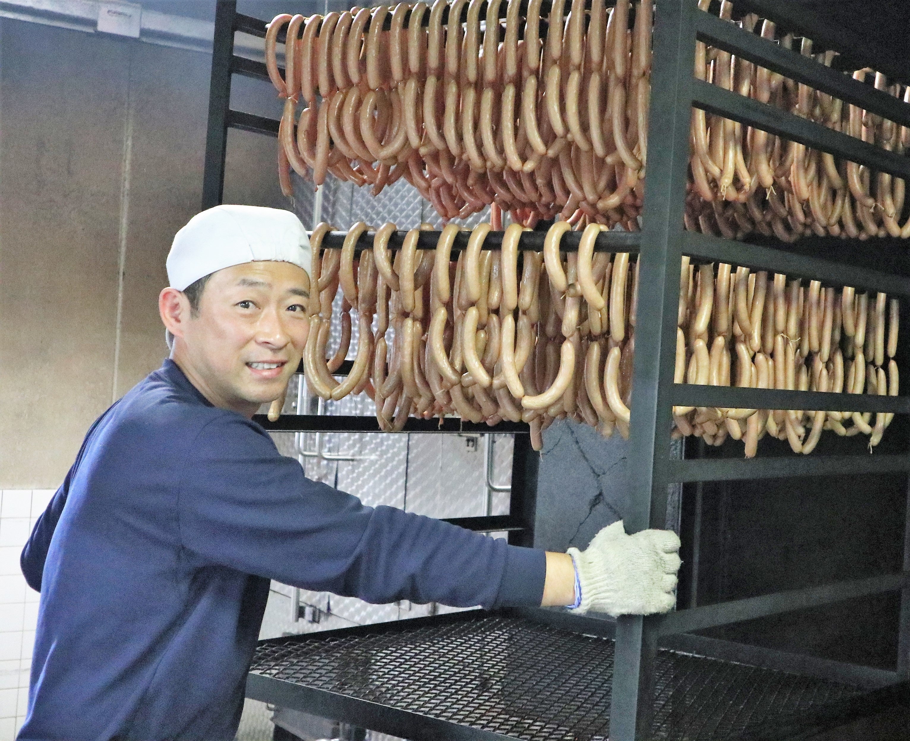 飽きのこない味にするために糖類は不使用。添加物もできるだけ使用せず、玉ねぎの自然な甘みを加え、日本人の好みに合ったきめの細かい食感を出すために、具材は社長が自ら練りあげています。スパイスはドイツから直輸入し、更にオリジナルで調合することで生まれる独特な味わいが特徴です。また、秋田県産のナラの薪を使って直火でじっくりとスモークする事により、香ばしく風味豊かに仕上げています。このように手間がかかってもいかに美味しいものを造り出すかにこだわり、日々手作りしています。