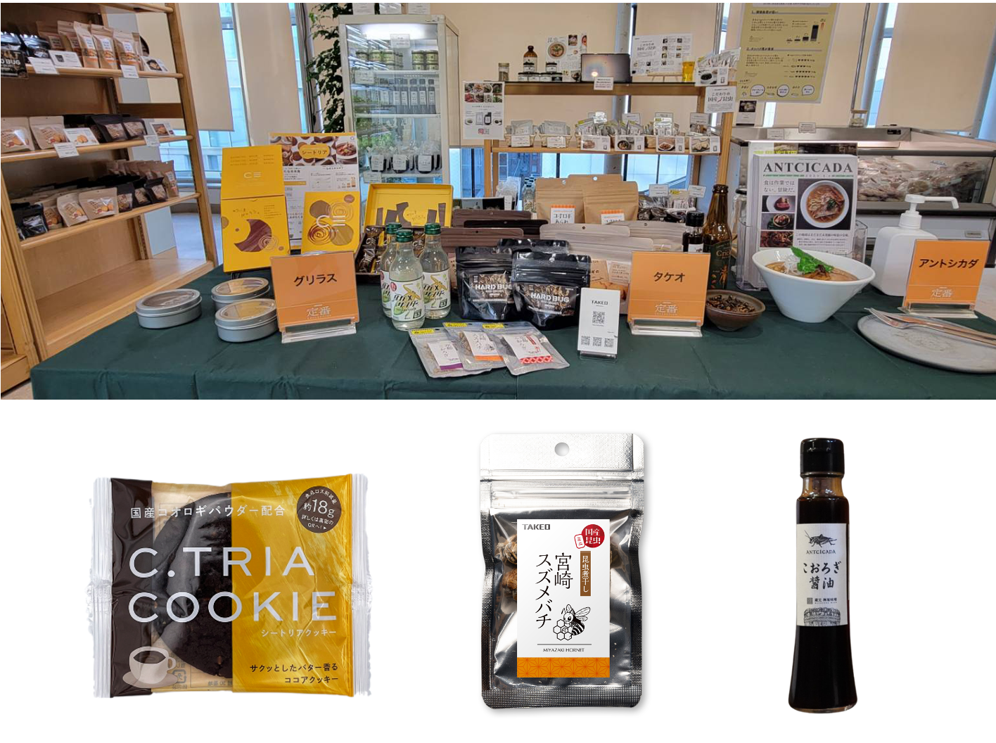 徳島大学で30年に渡って培われてきた研究成果を活かし、食品ロス由来100%の餌で飼育したコオロギを通じて「タンパク質危機」「食品ロス」の2つの社会課題の解決を目指す大学発ベンチャー。今回の出店では徳島県内で生産した食用コオロギのパウダーを使用した自社食品ブランド「C. TRIA(シートリア)」の商品13種を販売。