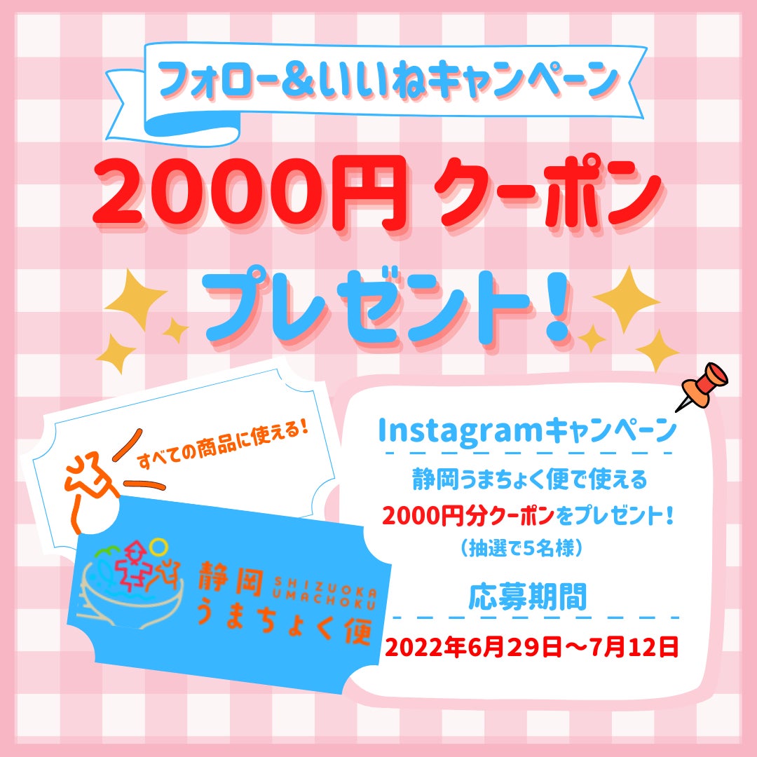 株式会社村の駅(所在地:静岡県三島市)が運営する、産地直送型の通販サイト「静岡うまちょく便」が、『うまい!で繋がるプロジェクト』プレゼントキャンペーン第2弾「Instagram フォロー& いいね キャンペーン」を2022年6月29日(水)より開します。参加された方の中から抽選で5名様に静岡うまちょく便のすべての商品にご利用いただける2,000円分のクーポンをプレゼントいたします。