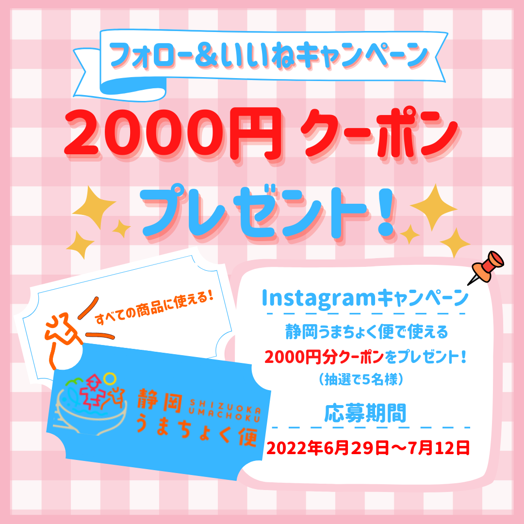 株式会社村の駅(所在地:静岡県三島市)が運営する、産地直送型の通販サイト「静岡うまちょく便」が、『うまい!で繋がるプロジェクト』プレゼントキャンペーン第2弾「Instagram フォロー& いいね キャンペーン」を2022年6月29日(水)より開します。参加された方の中から抽選で5名様に静岡うまちょく便のすべての商品にご利用いただける2,000円分のクーポンをプレゼントいたします。