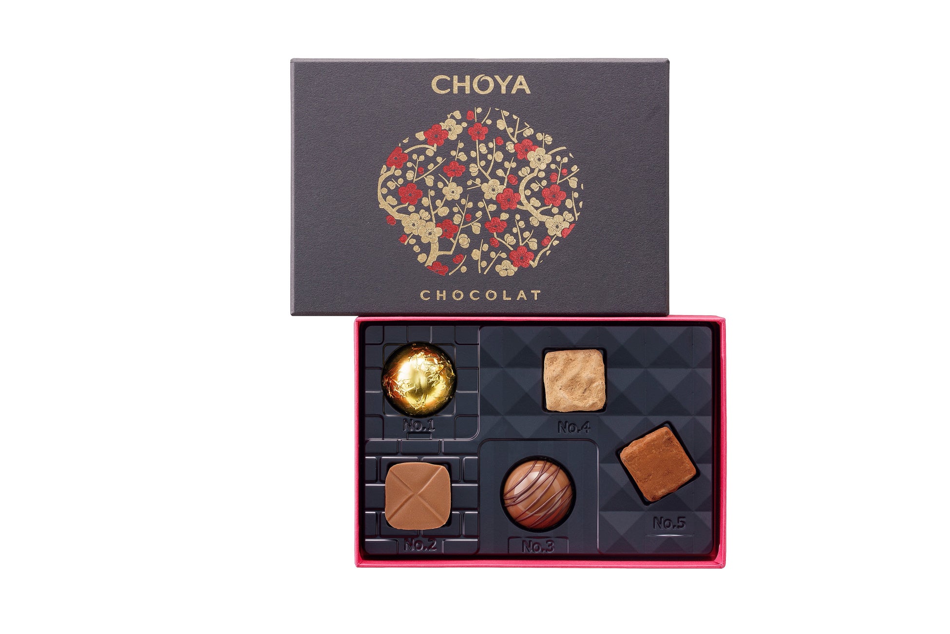 THE CHOYA紀州南高梅原酒を異なる5種類のショコラで楽しめる贅沢なセット。THE CHOYA紀州南高梅原酒を使用、添加物不使用のショコラアソートです。種類ごとに味や香りの感じ方が変わるショコラの特徴を活かして、CHOYAの魅力を最大限に引き出しました。
