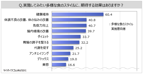 多様な食のスタイルのいずれかを実施したい人に、期待する効果を聞いたところ(複数回答)、「健康維持」が60.4%、「体調不良の改善、体の悩みの改善」「免疫力向上」「腸内環境の改善」が4割前後、「ダイエット」「胃腸の調子を整える」が各3割強です。糖質制限・ローカーボ実施意向者では、「ダイエット」の比率が高くなっています。