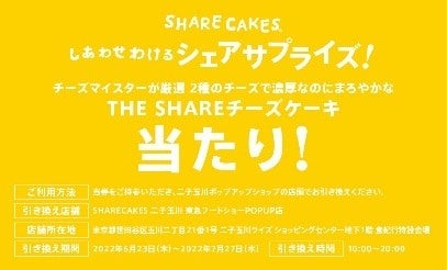 ■キャンペーン:本ポップアップストアにて「贅沢SHAREチーズケーキ」、「THE SHAREチーズケーキ」のいずれかをお買い上げいただいた方を対象に、ご購入商品の中に当たり券が入っていたら「THE SHAREチーズケーキ」を1本プレゼントいたします。※20名様限定