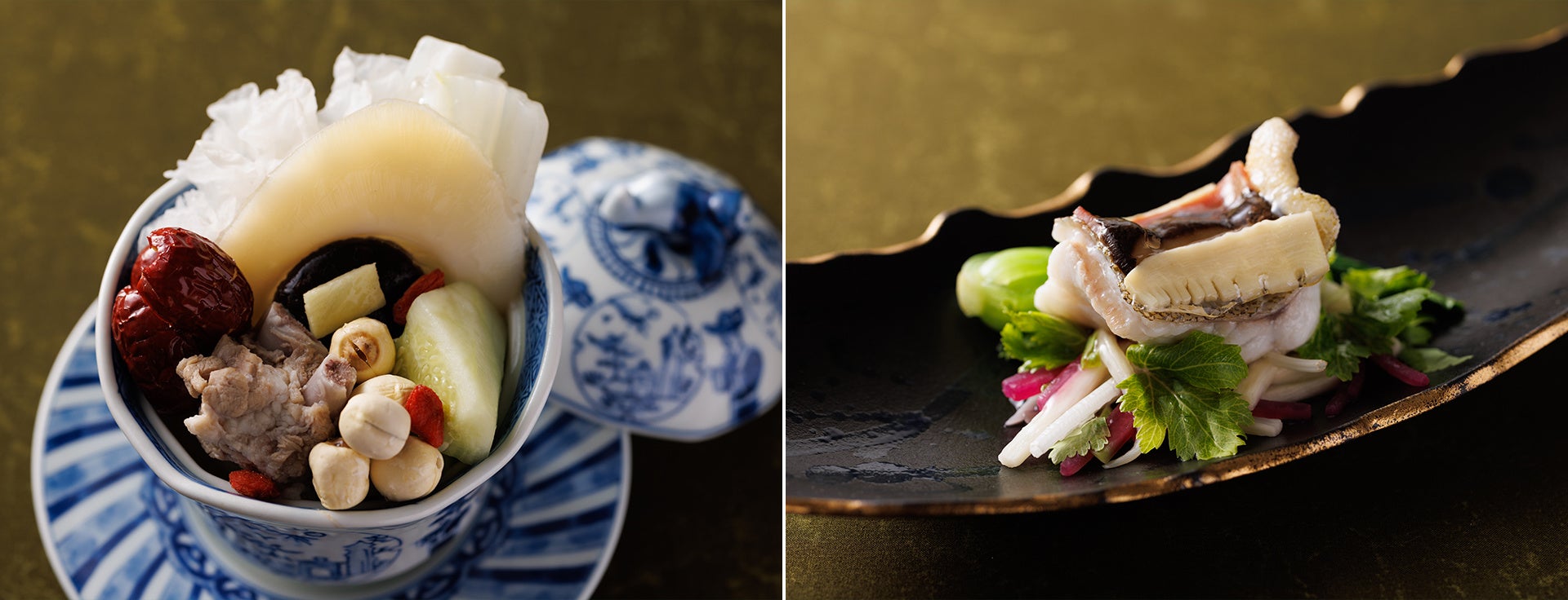 米澤豚のスペアリブ・白瓜・フカヒレ・白きくらげを、中国漢方に由来するクコの実、干し椎茸、蓮の実、生姜、なつめなどを使用し、じっくりと蒸しあげたスープです。
