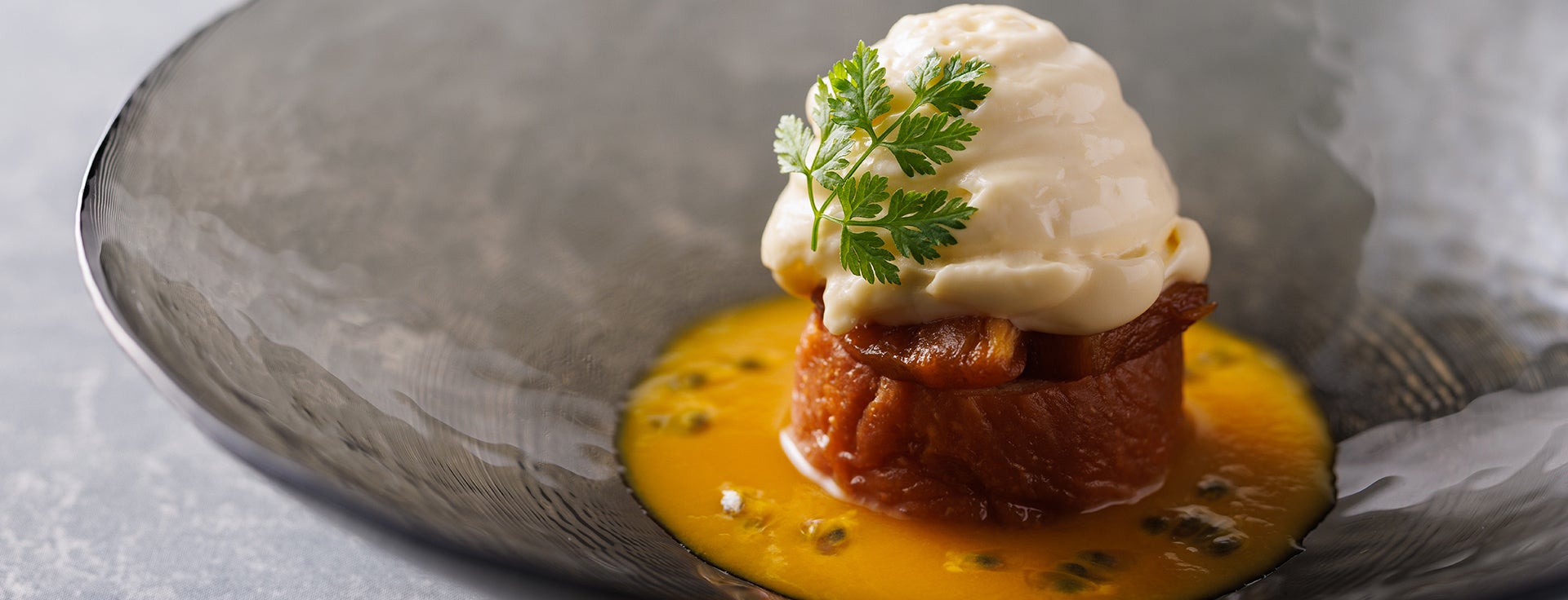 エキゾチックフルーツソースは、旬のパッションフルーツが入りより甘酸っぱく仕上げました。