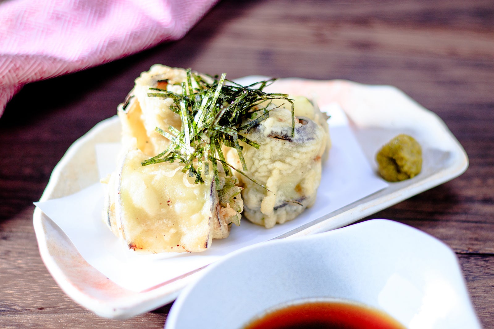 ナスで餃子のタネを巻いてアツアツの天ぷらに!口の中で広がる シソの香りが絶品です。