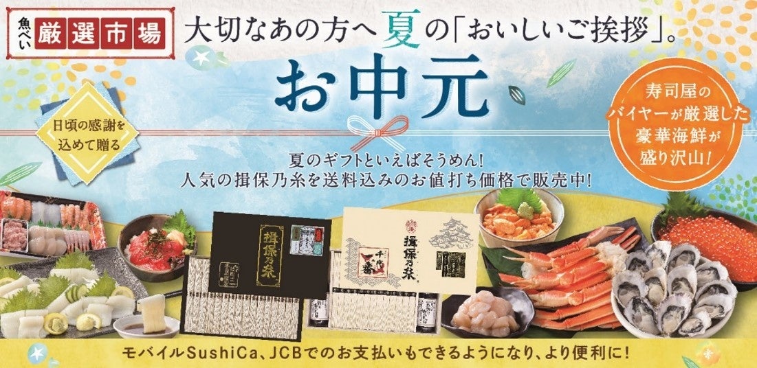 寿司レストランチェーンを展開する元気寿司株式会社(本社:栃木県宇都宮市 代表取締役社長 法師人尚史)は、元気寿司グループが運営するECサイト「魚べい厳選市場」にて、お中元商品を多く取り扱っております。その中で、1年間ゆっくり熟成させた手延素麺「揖保乃糸」熟成麺1.6Kgと、かつお風味豊かなつゆを2本をお付けした、「揖保乃糸特級品(ひね)・千代の一番つゆ詰合せ」を期間限定でお値打ち価格で販売中です。他にも豪華海鮮等をお値打ち価格にてご用意しております。