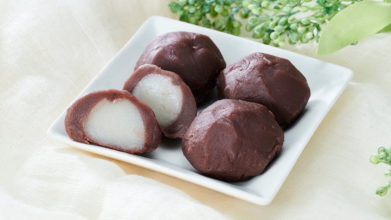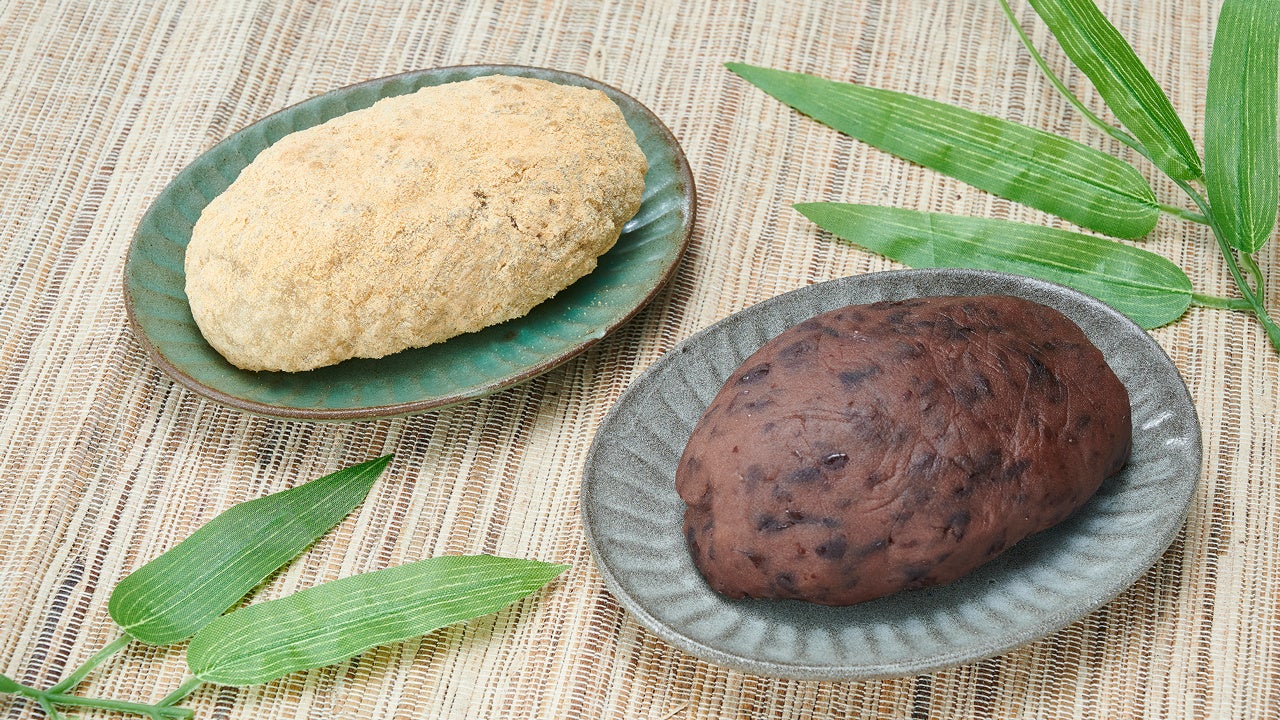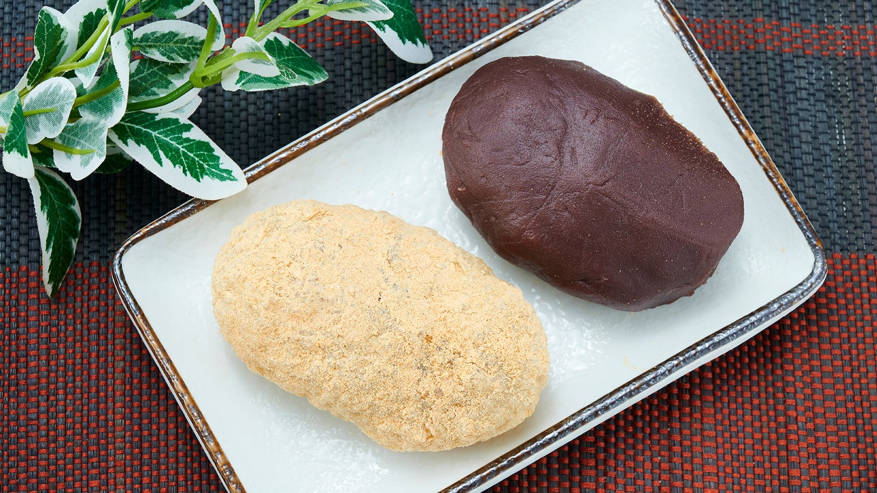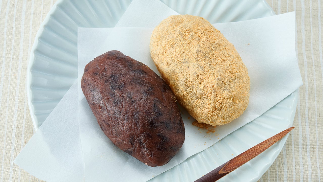 左:粒あん入りのおはぎに、香ばしいきなこをまぶしました。大きめサイズのおはぎです。