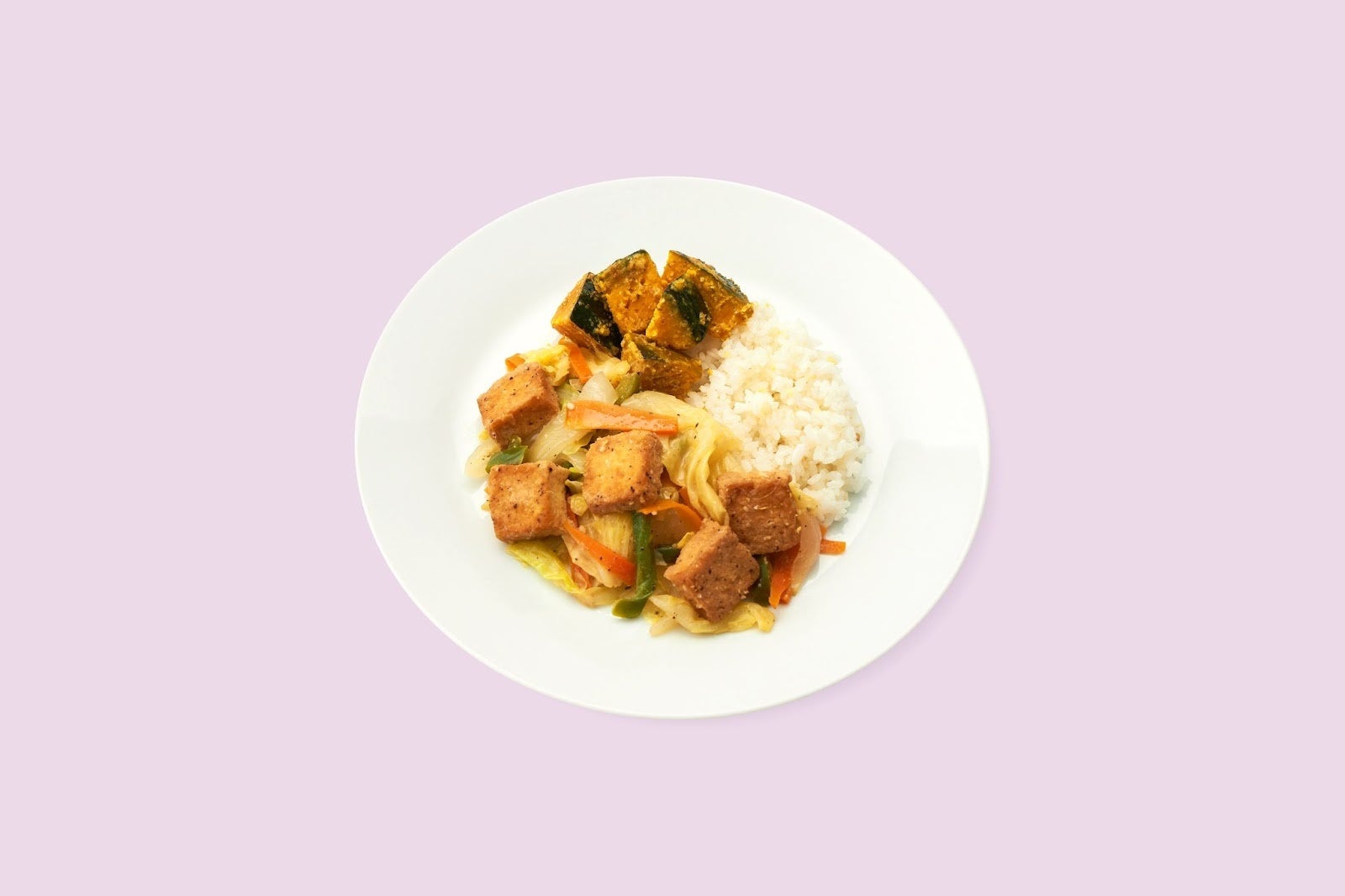 たっぷりのざく切りキャベツと厚揚げを、にんにく、しょうが、こしょうを効かせて、人参、玉ねぎ、ピーマンと一緒に香ばしい中華風の野菜炒めに仕上げました。日々の食事で野菜不足を感じている方にもオススメのメニューです。香ばしくコクのある味付けと、たっぷりの厚揚げで、野菜だけのメニューでもボリュームは満点です。付け合わせはカボチャサラダ。ごろっとした具材感と甘みをお楽しみください。