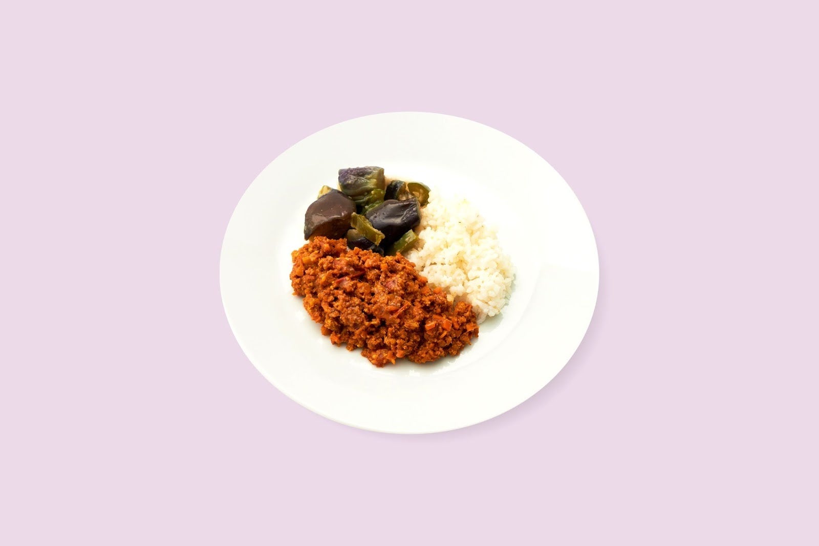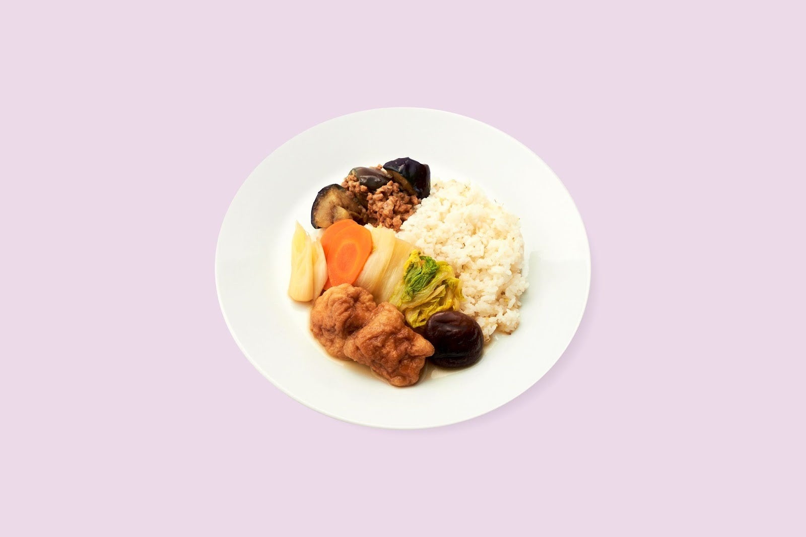 カレーソースは、粒感のある大豆ミートをトマトの旨味とスパイスの香ばしさを効かせて煮込んだ一品です。動物性の食材をつかっていなくても、味も香りも旨味も大満足。雑穀を混ぜ込んだご飯と相性は抜群。よく混ぜてお召し上がりください。副菜は、なすの田楽。ピリ辛なカレーの合間には、白みそとみりんの優しい甘辛さがピッタリです。