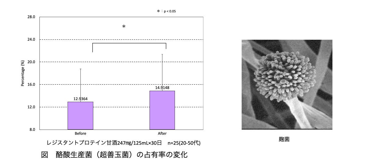 「レジスタントプロテイン」(以下RP)とは米、酒粕などに含まれる、難消化性タンパク質のこと。通常タンパク質は体内に入ると胃で分解されますが、このRPは分解されず、小腸へ移動して腸内環境を整えます。市販の甘酒にはRPが含有されていることが、共同開発者の一人でもある金沢工業大学の教授、尾関健二氏の研究により明らかになりました。