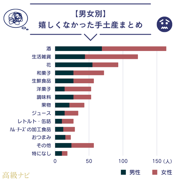 酒が嬉しかったと回答した男性は女性の3倍もいました。酒の手土産は男性に人気だと考えられます。