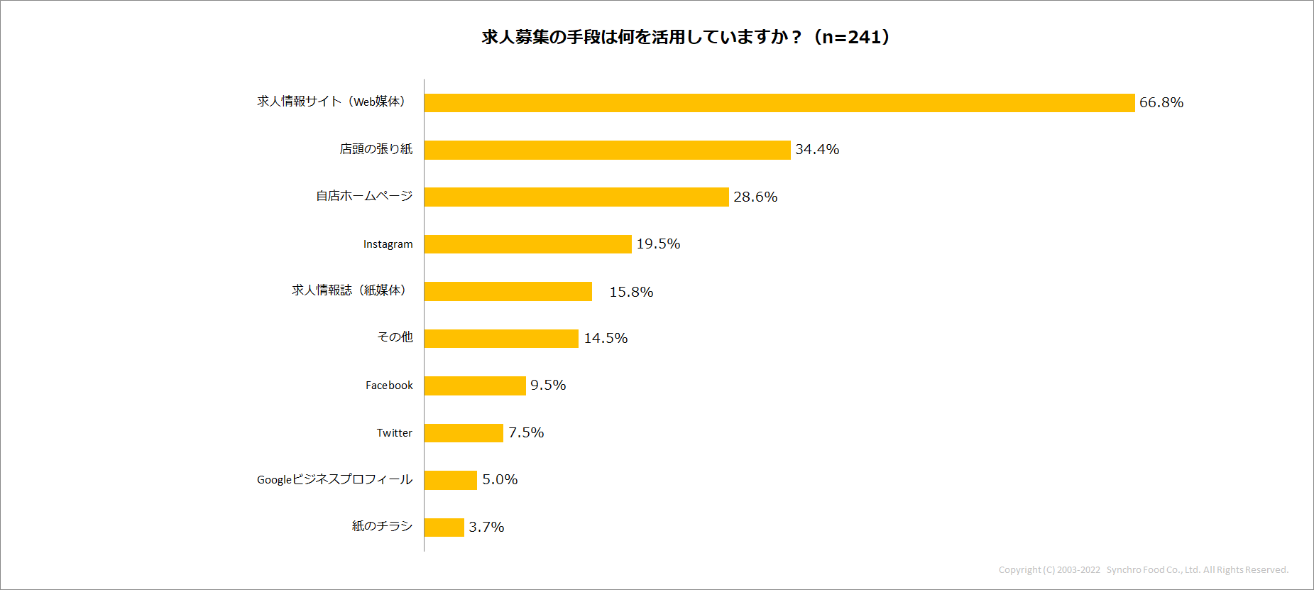 また、直近1ヶ月で求人募集をしたと回答した方に、どのような手段で募集を行ったか伺ったところ、最も多かったのは「求人情報サイト(Web媒体)」で66.8%でした。次いで「店頭の張り紙(34.4%)」、「自店ホームページ(28.6%)」、「Instagram(19.5%)」と続くことから、WebやSNSを使った求人募集が主流になるなか、アナログの手段も並行して活用されている現状が見えてきます。