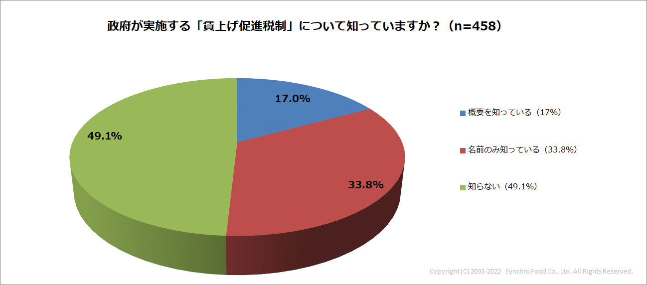 そこで、この「賃上げ促進税制」の認知状況について尋ねたところ、最多は「知らない」で、49.1%。概要まで含めると、8割以上が認識していないという結果になりました。さらに、前述した賃金の総額の変化や増額率に関する回答をみると、適用要件に当てはまる店舗は26%と、3割にも満たないことがわかりました。
