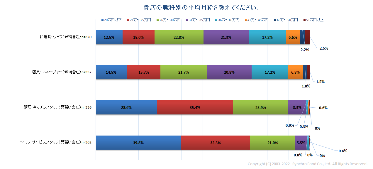 さらに、職種別の平均月給について尋ねると、「料理長・シェフ」、「店長・マネージャー」では、「26万〜30万円(22.8%、21.7%)」が最も多い結果に。同様に「調理・キッチンスタッフ」では「21万〜25万円(35.4%)」、「ホール・サービススタッフ」では「20万円以下(39.8%)」が最多となりました。