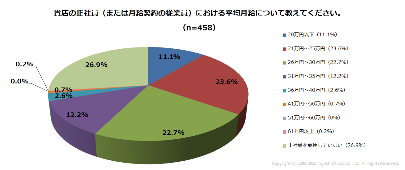 次に、正社員(または月給契約の従業員)の平均月給を聞いたところ、「正社員を雇用していない」との回答が最も多く、26.9%でした。一方、正社員を雇用している店舗では「21万円〜25万円(23.6%)」が最多となり、次いで「26万〜30万(22.7%)」、「31万〜35万(12.2%)」と続きました。