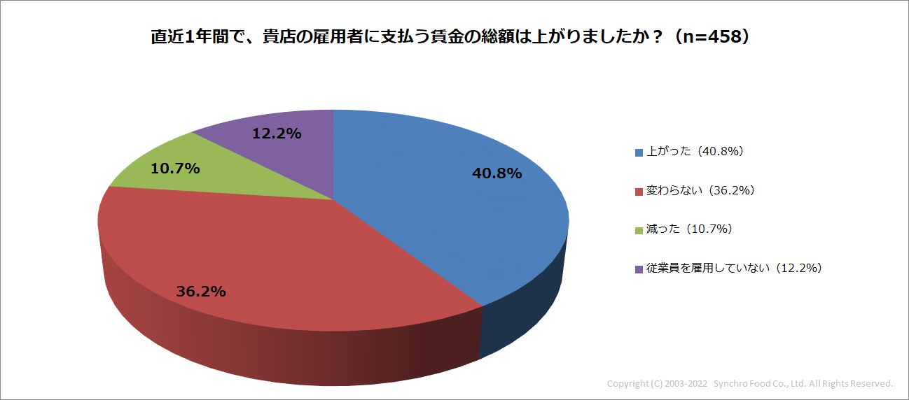 次に、直近1年間で雇用者に支払う賃金の総額に変化があったかを尋ねたところ、最多は「上がった」との回答で、40.8%。次いで、「変わらない(36.2%)」、「減った(10.7%)」と続きました。