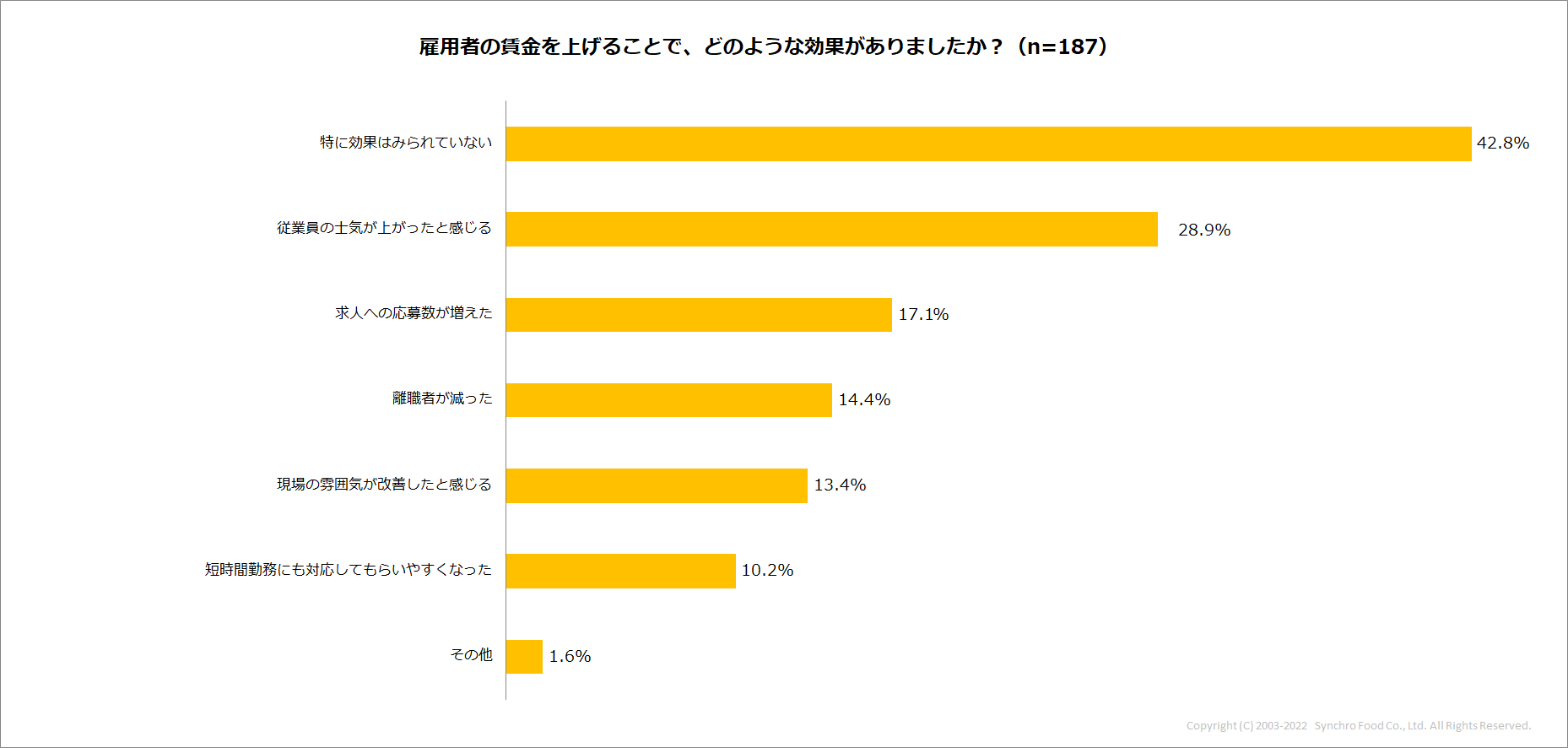 さらに、雇用者の賃金を上げることで、どのような効果があったかを伺いました。最も多かったのは「特に効果がみられていない(42.8%)」だったものの、「従業員の士気が上がったと感じる(28.9%)」、「求人への応募が増えた(17.1%)」、「離職者が減った(14.4%)」など、「賃金の総額が上がった」と回答した飲食店のうち、6割近くの店舗でポジティブな影響があったこともわかりました。
