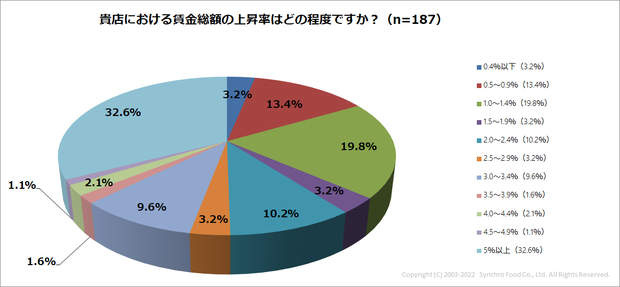 また、「上がった」と回答した方におおよその増額率を尋ねたところ、「5%以上」が最も多く、32.6%でした。続いて「1.0〜1.4%(19.8%)」、「0.5%〜0.9%(13.4%)」となり、地域や業態の差が顕著に示される結果となりました。