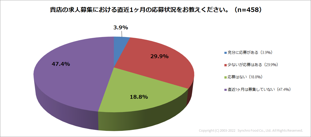 そのうえで直近1ヶ月間の求人募集とその応募状況を聞くと、最多は「直近1ヶ月は募集していない」で47.4%でした。求人募集を行っている飲食店(n=241)のうち、56.8%は応募数が少ないと感じており、35.7%は応募自体がないことも明白となりました。