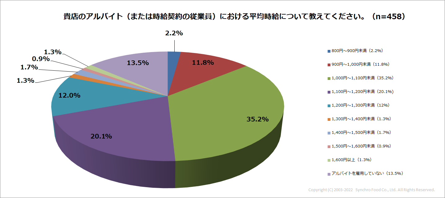 アルバイト(または時給契約の従業員)の平均時給については、「1,000円〜1,100円未満」が最も多く35.2%。次いで「1,100円〜1,200円未満」が20.1%となりました。これは、本アンケートの回答者が経営する飲食店の52.4%が東京都にあること、東京都の最低賃金時間額が1,041円(2022年6月現在)であることなどを鑑みると、妥当な結果と捉えられます。