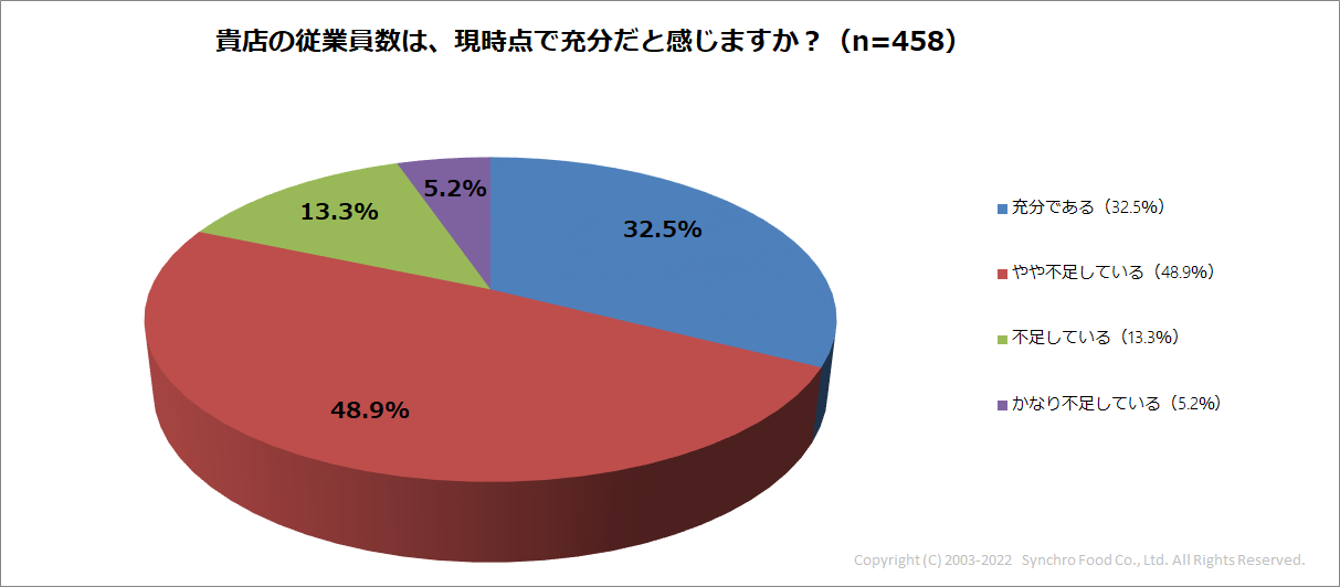 まず、アンケート回答者の店舗における従業員数の充足状況を尋ねたところ、現状は「やや不足している」が最も多く、48.9%。次いで、「充分である(32.5%)」、「不足している(13.3%)」、「かなり不足している(5.2%)」との結果になりました。集計すると、67%以上が人材不足を実感していることがわかります。