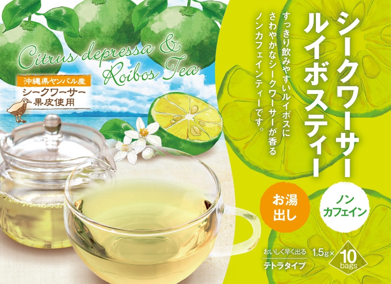 グリーンルイボスティーに沖縄県ヤンバル産シークワーサーの果皮チップを加えたフレーバーティーです。果汁を搾汁した後のシークワーサー果皮をチップとして再利用することで、食品廃棄物をなくし、環境に配慮しています。香料は使用せず、ナチュラルなシークワーサーの香りと風味を味わっていただけます。