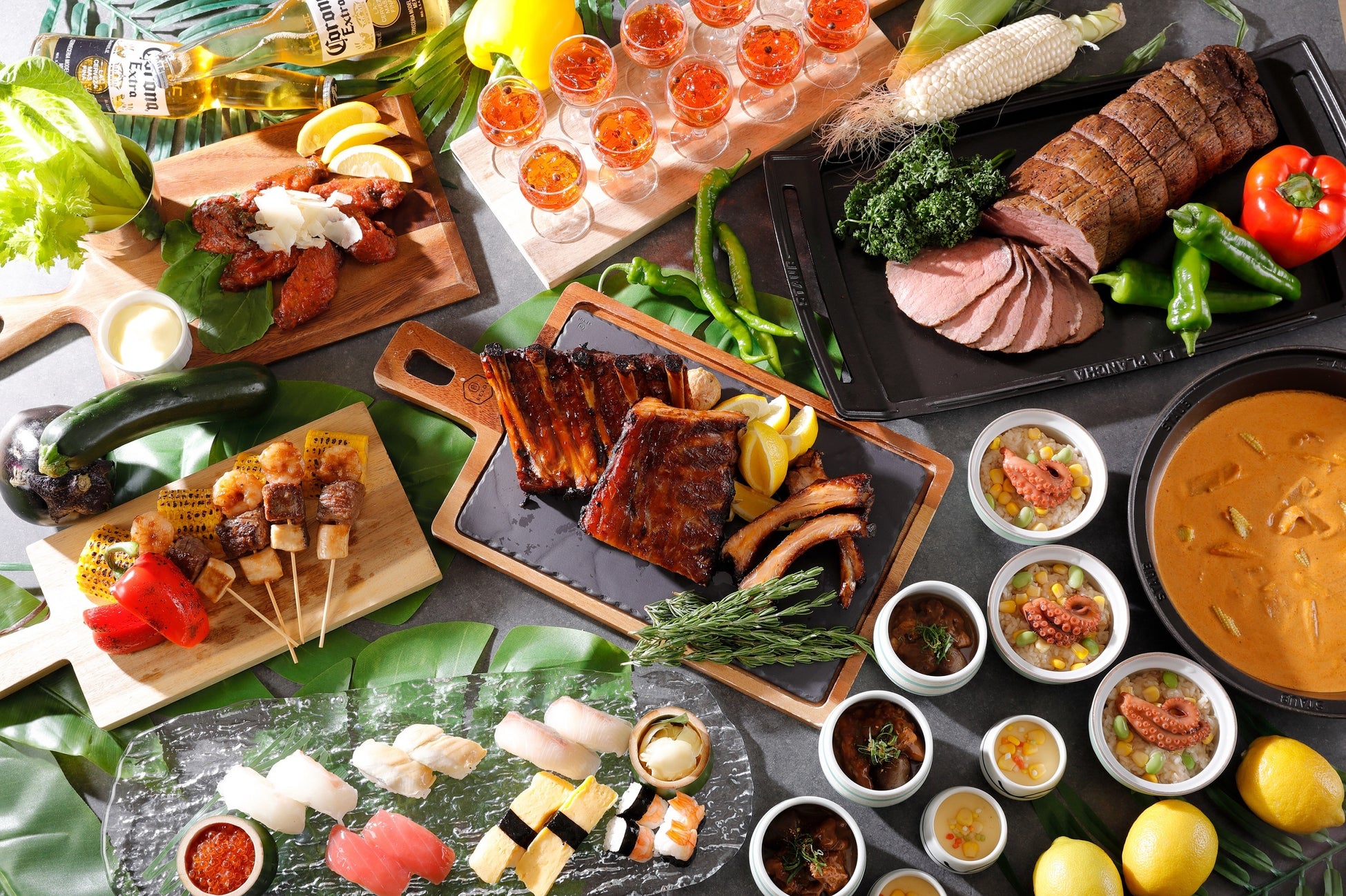 産地直送にぎり寿司 / 天ぷら(海老・ハモおとし・夏とれ野菜各種) / 鯛だしラーメン / うどん / 鱒いくらボール(土日祝限定) / ホテルオリジナル引き立てコンソメスープ / 生ハムスライスサービス / ローストビーフ / チーズとソーセージのショートパスタ / ポークバックリブB.B.Q / 牛肉のステーキ焼き野菜添え / ジャンバラヤとチキンサテ ワゴンサービス(土日祝限定)