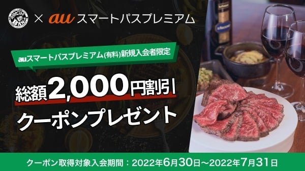 内容: 「auスマートパスプレミアム」に新規入会された方を対象に、「原価ビストロBAN!」で使用できる合計2,000円分クーポンをプレゼントします。