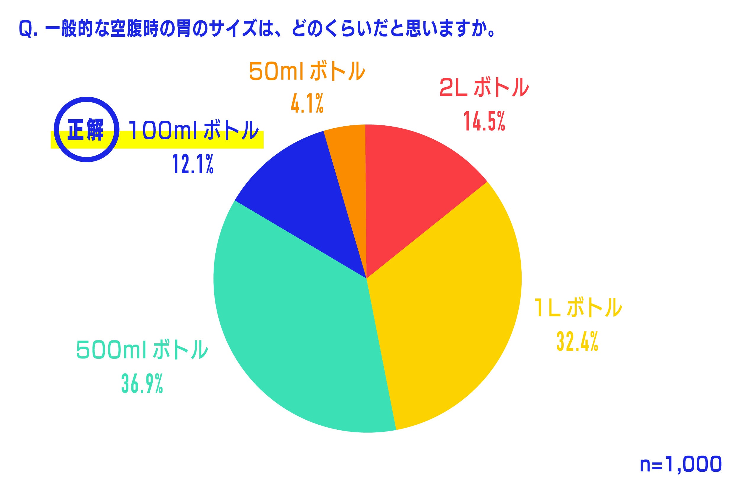 空腹時の胃のサイズについて聞いたところ、最も回答が多かったのは、「500mlペットボトル」(36.9%)でした。次いで「1Lペットボトル」(32.4%)、「2Lペットボトル」(14.5%)、「100mlボトル」(12.1%)と続きました。一般的に空腹時の胃の大きさは、「明治プロビオヨーグルトLG21 ドリンクタイプ」とほぼ同じ大きさで、100ml程度と言われています。ところが、食べ物を食べると、大人の場合、1.5~2リットルと15倍から20倍ほどに膨らむと言われています。