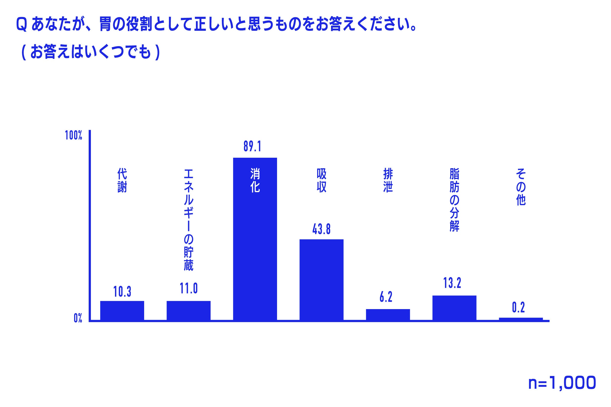 正しいと思う胃の役割について聞いたところ、最も回答が多かったのは、「消化」(89.1%)でした。次いで「吸収」(43.8%)、「脂肪の分解」(13.2%)、「エネルギーの貯蔵」(11.0%)と続きました。しかしながら、約10人の1人の方は、胃の役割が「消化」であることを知らないという結果となりました。