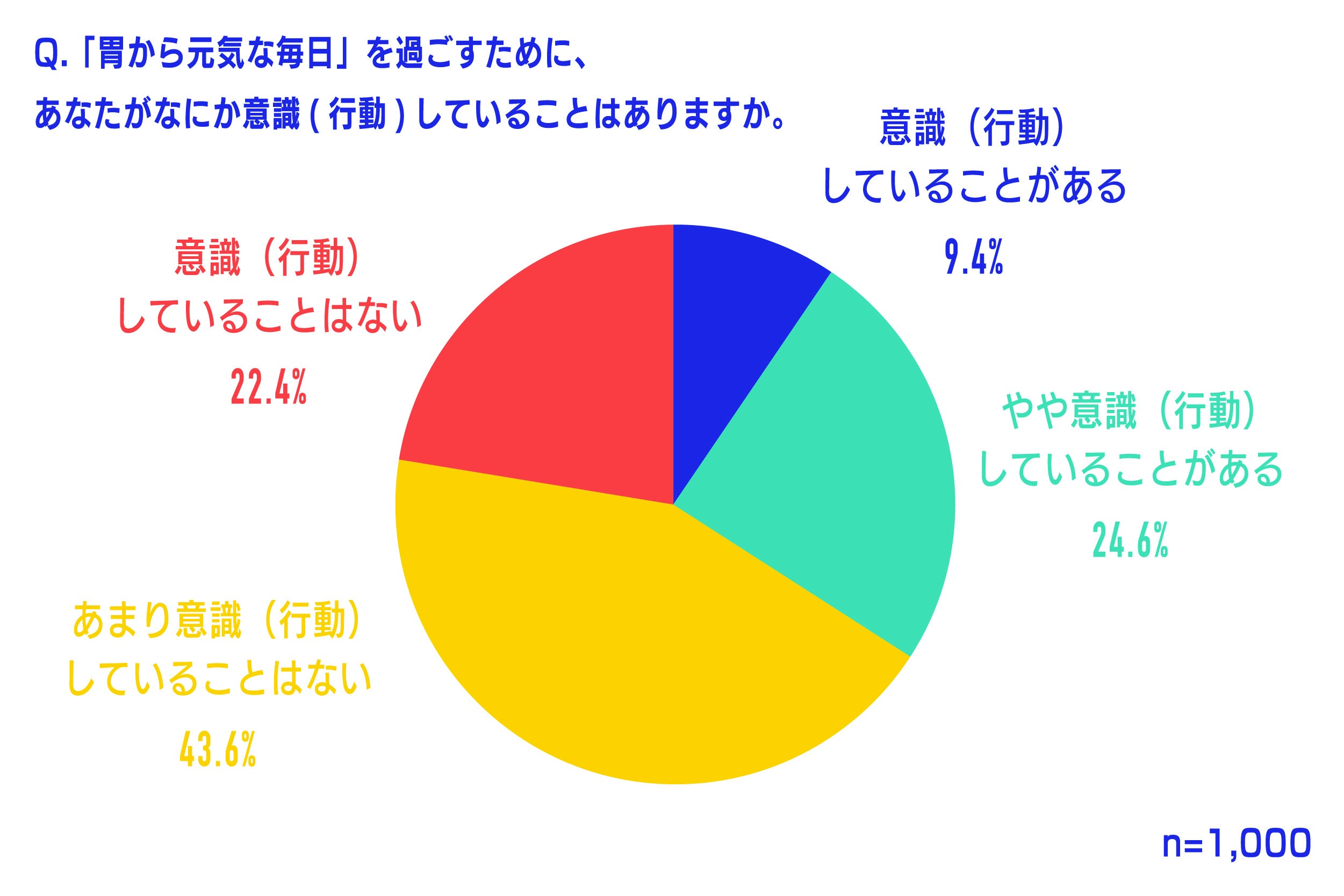胃のために意識(行動)していることについて聞いたところ、「意識(行動)していることはない」は22.4%、「あまり意識(行動)していることはない」は43.6%で、合計すると66.0%でした。