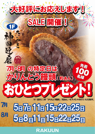 7月・8月の特定日、先着100名様に 1会計につき「かりんとう饅頭(粒あん)」をおひとつプレゼント致します。