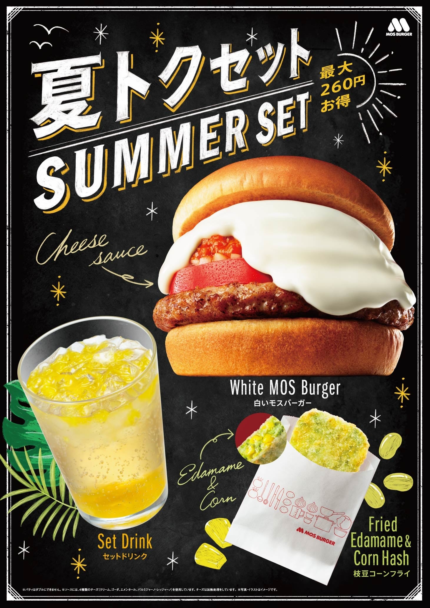 「夏トクセット」は、夏の期間限定メニューをお得にお求めいただけるセットです。セット内容は、「白いモスバーガー」+「枝豆コーンフライ」+「セットドリンク」の組み合わせです。