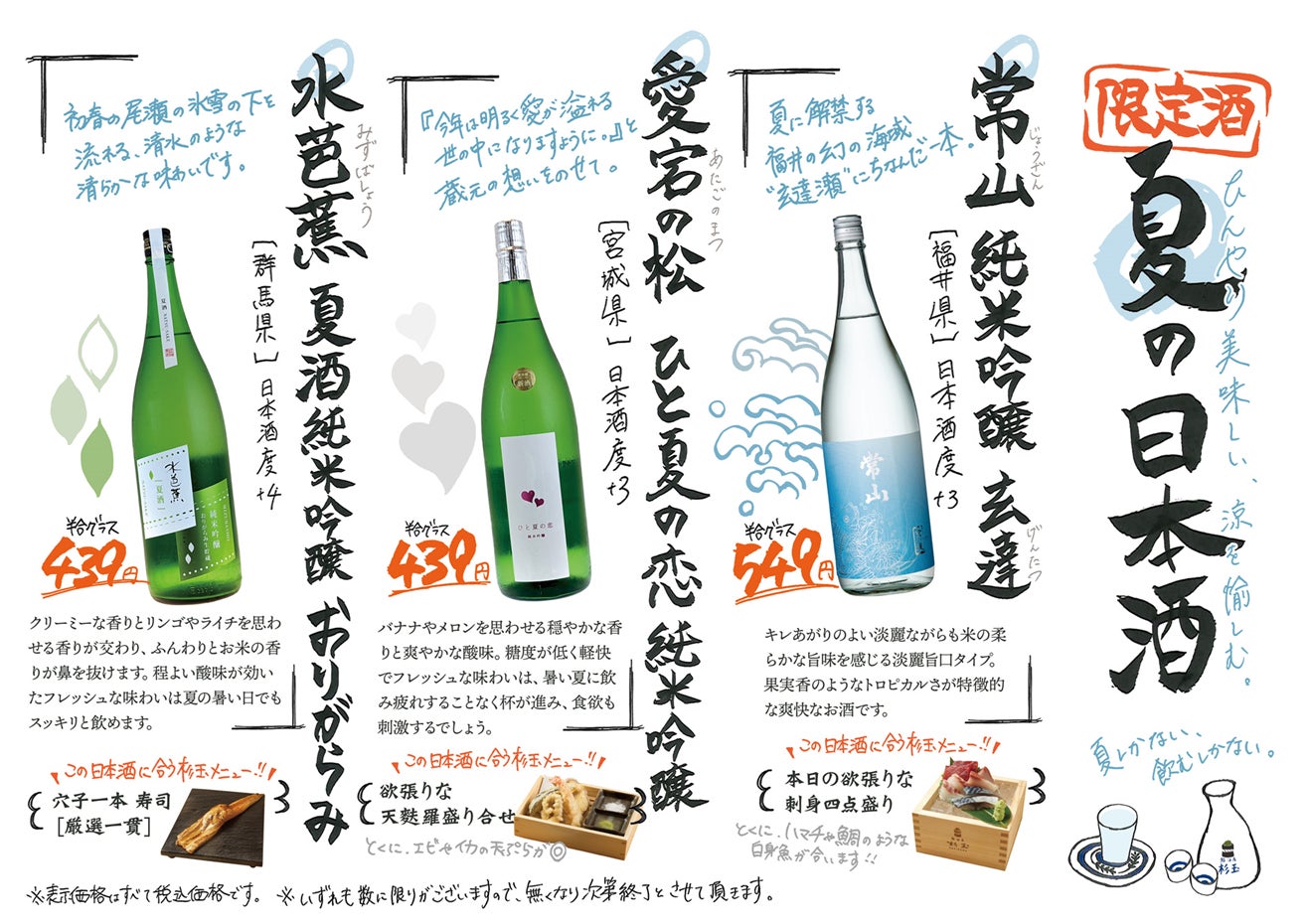 そして、同日より、全国各地の厳選した地酒をお楽しみいただけるよう、群馬県や宮城県、福井県のひんやり美味しい季節限定の3種類の地酒をご用意しております。