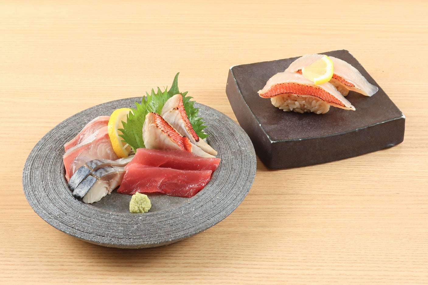 7月1日(金)より、高級魚である天然の国産金目鯛と、夏にさっぱりとお召し上がりいただける炭焼き鰹のたたき、お酒との相性抜群な富山県産のホタルイカを使った商品をご提供いたします。天然の国産金目鯛は、脂がのったものを厳選し、軽く塩〆をすることで、旨みを凝縮させています。ご提供前に皮目を炙り、香ばしさととろける脂の旨みをご堪能いただける、刺身の盛り合わせと寿司の2種類を各399円(税込439円)ご提供いたします。